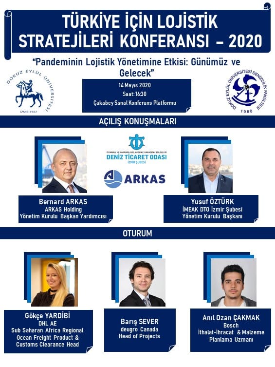 Dokuz Eylül Üniversitesi Denizcilik Fakültesi'nin düzenlediği Türkiye İçin Lojistik Stratejileri Konferansı, İMEAK Deniz Ticaret Odası İzmir Şubesi Yönetim Kurulu Başkanı Yusuf Öztürk ve Arkas Holding Yönetim Kurulu Başkan Yardımcısı Bernard Arcas'ın açılış konuşması ile başlayacak.