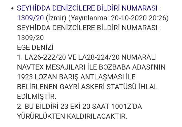 Son dakika haberine göre, Türkiye, Ege Denizi'nde yeni Navtex yayınladı. Semadirek, Limni ve Bozbaba Adaları'nın Lozan Barış Antlaşmasıyla belirlenen gayri askeri statüsünün ihlal edildiği belirtildi.