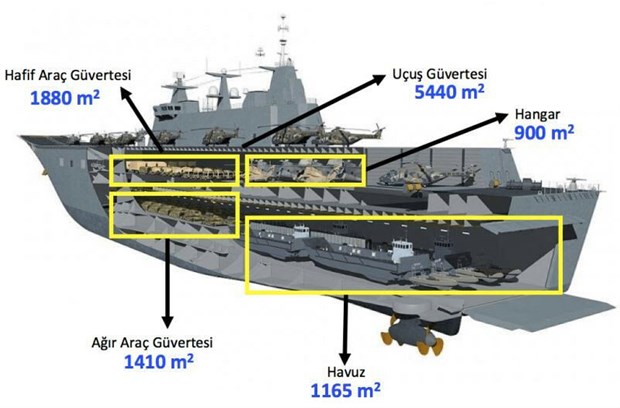 Dev gemide 11 adet de farklı büyüklüklerde güverte yer alıyor. Gemi bin 165 metrekarelik havuza, 6 iniş alanı ve uçuş rampasına da sahip. Bir tabur ile gerekli muharebe ve destek araçlarını ana üs desteği olmadan kriz bölgelerine taşıyabilecek dev gemi tüm denizlerde de kullanılabilecek.