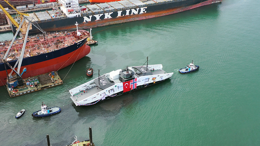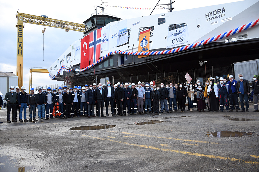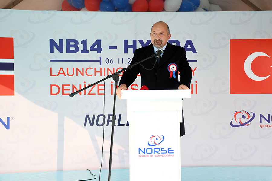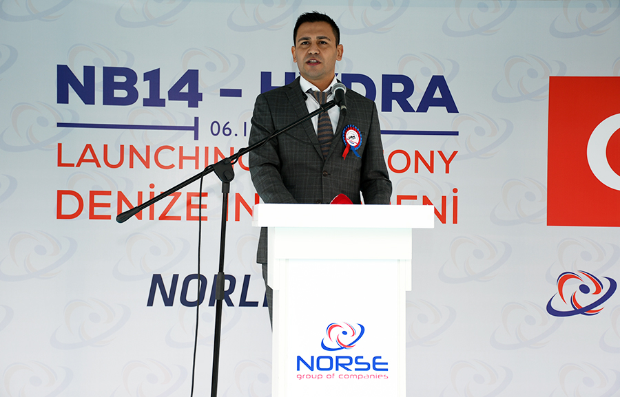 Son yıllarda gemi inşa alanında hız kazanan Türkiye-Norveç yakınlaşması sektöre önemli katkılar sağladı. Bizler de bu süreçte iki ülkenin ortaklığında kurulan Norse markamızın temellerini attık. Genç, dinamik, coşkulu ve üretken ekibimizle önemli projelere imza atarak iki ülke arasındaki ilişkilerin gelişmesine katkı sağladık. Norveçli balık çiftlikleri için çok maksatlı servis botları inşa ederek başlayan serüvenimiz 2019 yılında Westcon için inşa ettiğimiz 42 metre boyunda, tamamen alüminyum ve elektrikle çalışan feribot projemizle başka bir boyuta taşındı. Bugün, 80 araç, 299 yolcu taşıma kapasitesine sahip Hydra adlı feribotumuzun denize inişi için bir araya geldik. Belirtmek istiyorum ki bugün dünyanın ilk hidrojenle çalışan feribotunun suya inişine tanıklık edeceğiz. Projenin detay tasarımları grup firmamız olan Norse Dizayn tarafından yapıldı. Arka planda özveriyle çalışarak işlerimizi kolaylaştıran ekibe teşekkür ediyorum. Bize güvenen Westcon Tersanesi’ne, Norled firmasına, alt yüklenicilerimize, projede emeği geçen tüm Norse ekibimize ve finans kuruluşumuza teşekkür ediyorum.