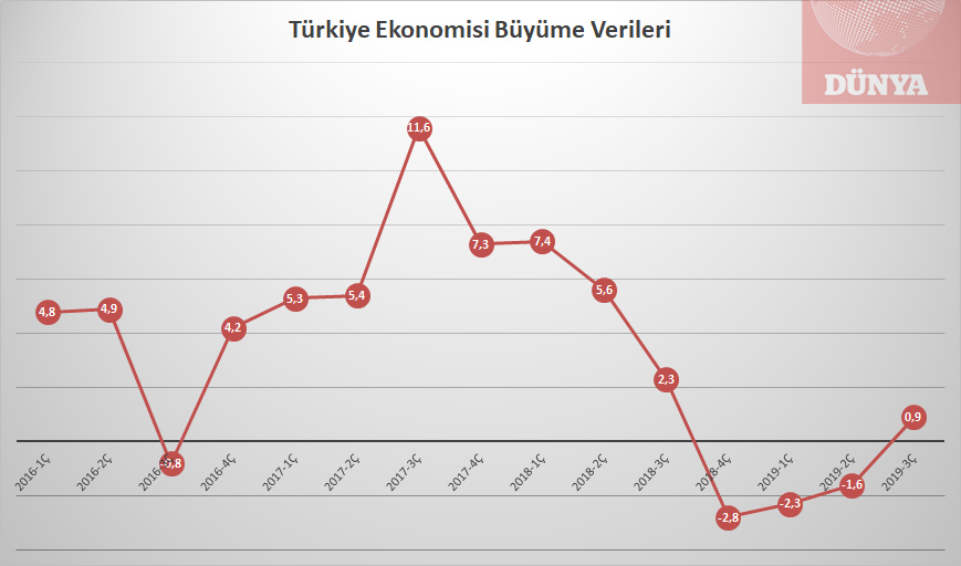 Son üç çeyrekte küçülen Türkiye ekonomisi, 2019 üçüncü çeyreği itibarıyla bu seriyi sonlandırmış oldu. Türkiye ekonomisi 2018'in son çeyreğinde yüzde 2,8, 2019 yılın ilk çeyreğinde yüzde 2,3, ikinci çeyrekte ise yüzde 1,6 küçülmüştü.