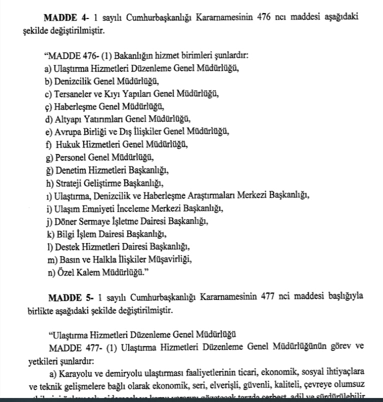Resmî Gazetenin bugünkü (17 Ocak 2020 Tarihli ve 31011 Sayılı Resmi Gazete) sayısında yayınlanan Cumhurbaşkanlığı kararnamesi ile Ulaştırma ve Altyapı Bakanlığının hizmet birimlerinde de değişikliğe gidildi.