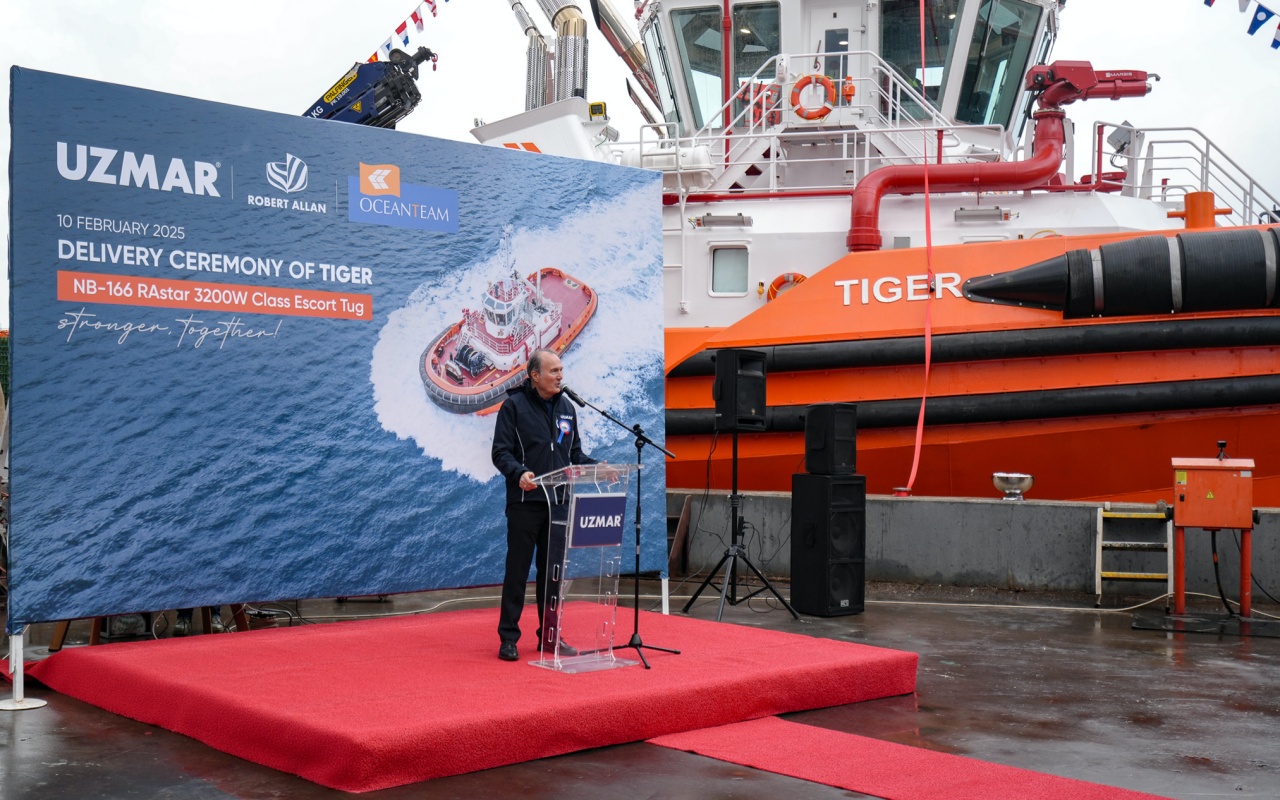 UZMAR Tersanesi, NB-166 ‘TIGER’ isimli son teknoloji RAstar 3200W Sınıfı 80 TBP Eskort Römorkörünü İtalyan operatör OCEAN S.R.L.’ye başarıyla teslim etti. Kanadalı gemi dizayn firması Robert Allan Ltd. tarafından OCEAN S.R.L.'nin operasyonel gereksinimlerine özel olarak tasarlanan bu römorkör, üstün manevra kabiliyeti ve eskort performansıyla tanınan RAstar 3200W serisinin en yeni ve üstün teknolojik halin temsil ediyor.
