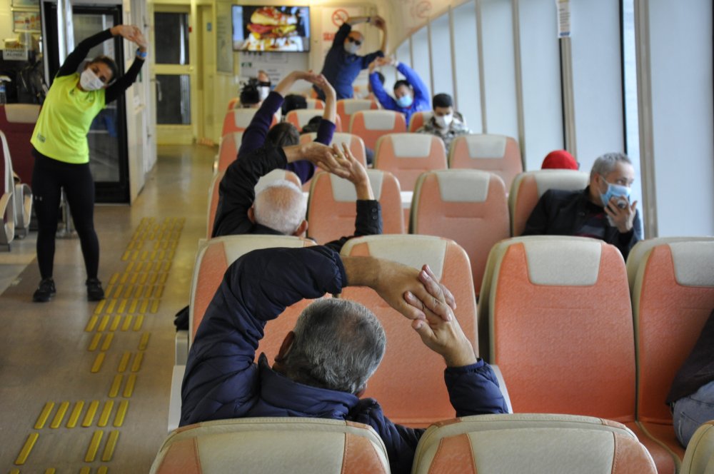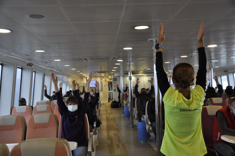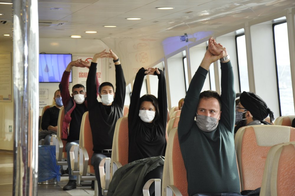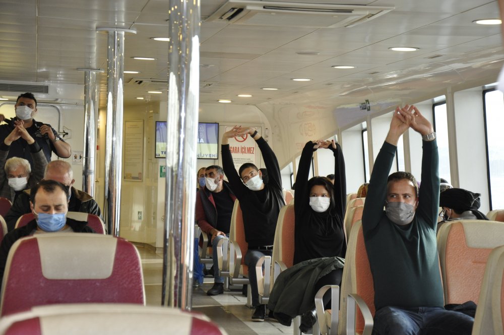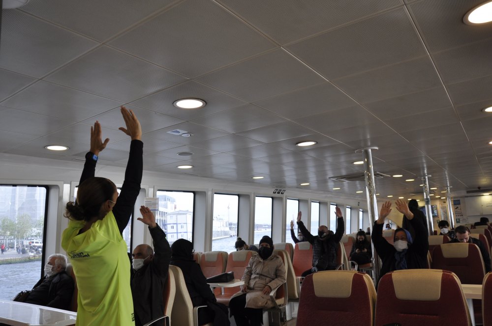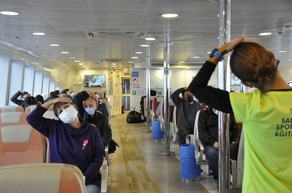 Spor İstanbul’un deneyimli spor hocaları, yolculara koltuklarından kalkmadan, boyun, omuz ve sırt kaslarını çalıştıracak, esnetecek ve gevşetecek egzersizler yaptırıyorlar. Sosyal mesafe kuralına uygun olarak, oturarak yapılan egzersizler, nabzı yükseltmiyor ve terletmiyor. Yolcuların büyük çoğunluğunun eşlik ettiği egzersiz programları yaklaşık 15 dakika sürüyor. Spor hocaları ayrıca egzersizlerin omurga ve kas sağlığı üzerindeki olumlu katkısını da anlatıyorlar.