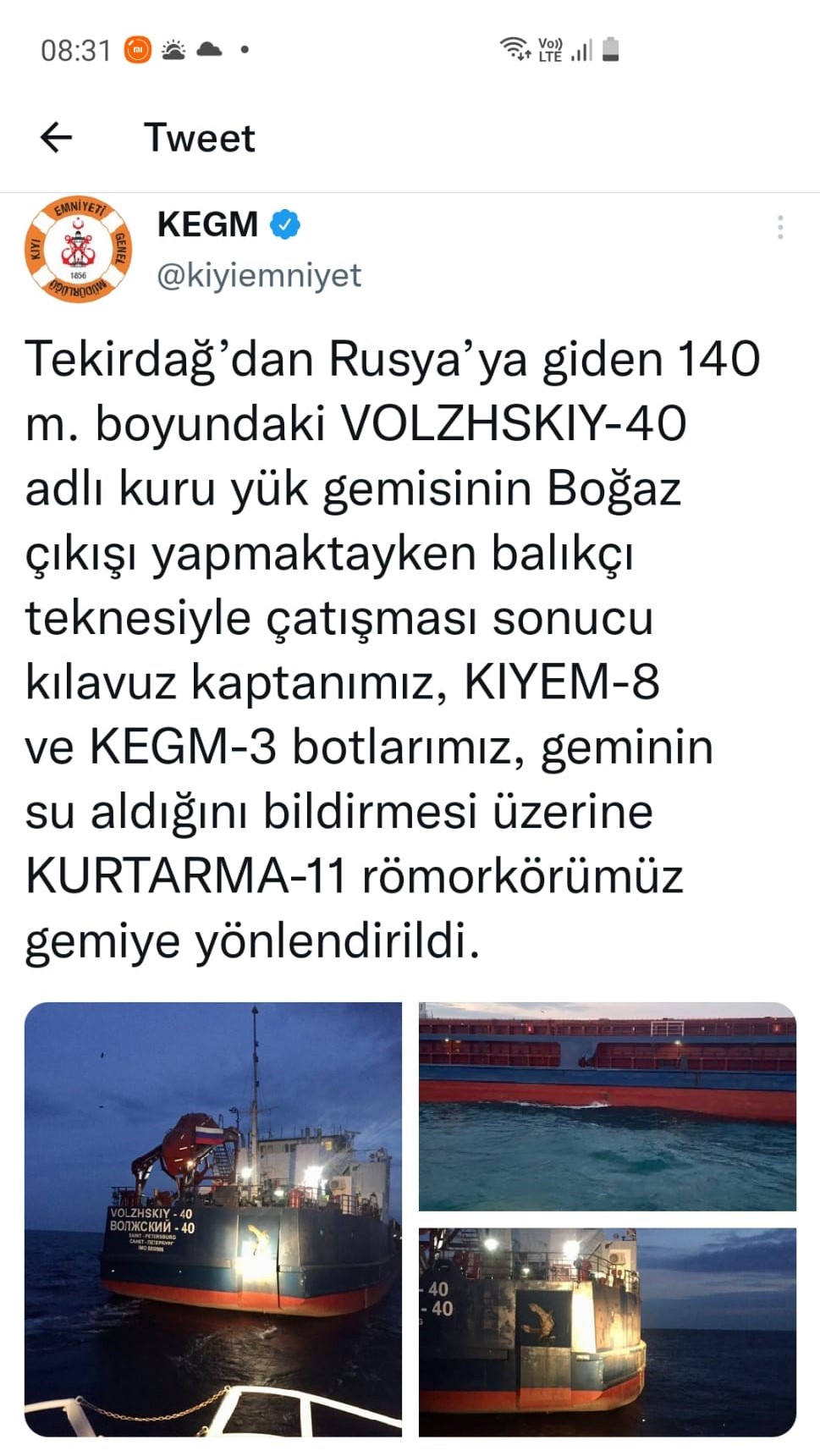 Tekirdağ’dan Rusya’ya giden 140 m. boyundaki VOLZHSKIY-40 adlı kuru yük gemisinin Boğaz çıkışı yapmaktayken balıkçı teknesiyle çarpıştı. Gemide bulunan kılavuz kaptan ve KIYEM-8 ve KEGM-3 botları, geminin su aldığını bildirmesi üzerine KURTARMA-11 römorkörü gemiye yönlendirildi.