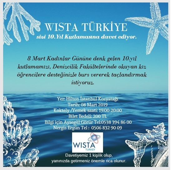 WISTA Türkiye, her yıl olduğu gibi bu yıl da 8 Mart Dünya Kadınlar Günü dolayısıyla bir organizasyona imza atıyor. WISTA Türkiye, 8 Mart Dünya Kadınlar Günü’ne denk gelen 10. Yıl kutlamasından elde edilecek olan destekleri, Denizcilik Fakültelerinde okuyan 200 kız öğrenciye burs vererek taçlandırmayı hedefliyor.