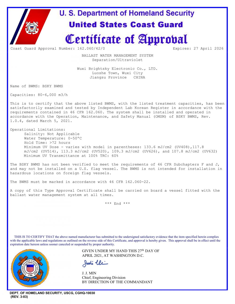 Yaf Diesel, temsilciliğini yaptığı, dünyanın ilk ve tek filtresiz Uv Ballast Water Management Sistemi olan BSKY'in, USCG Tip Onay sertifikasını aldığını duyurdu.