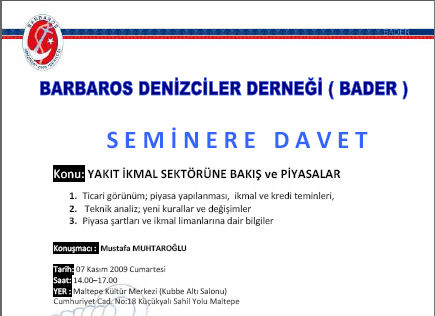 BADER, seminerler serisine bir yenisiyle devam ediyor. Barbaros Denizciler Derneği (BADER) tarafından “Yakıt ikmal sektörüne bakış ve piyasalar” konulu bir seminer yapılacak.