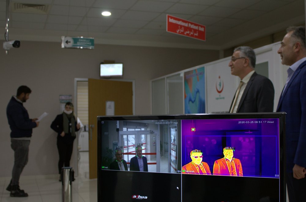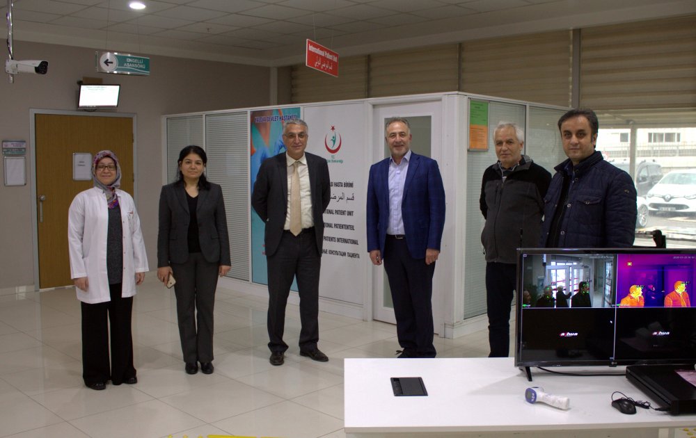 Yalova Devlet Hastanesi Ek Binası girişine kurulan sistem; kapıdan girenlerin beden sıcaklığını otomatik olarak ölçüyor ve belirlenen derecenin üstünde bir sıcaklık görünce sesli ikaz veriyor.
