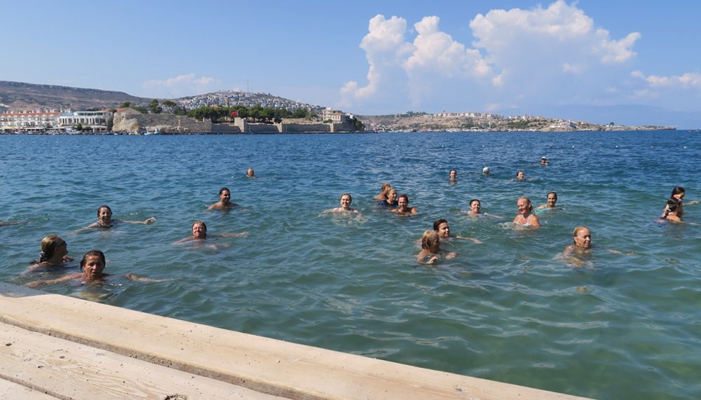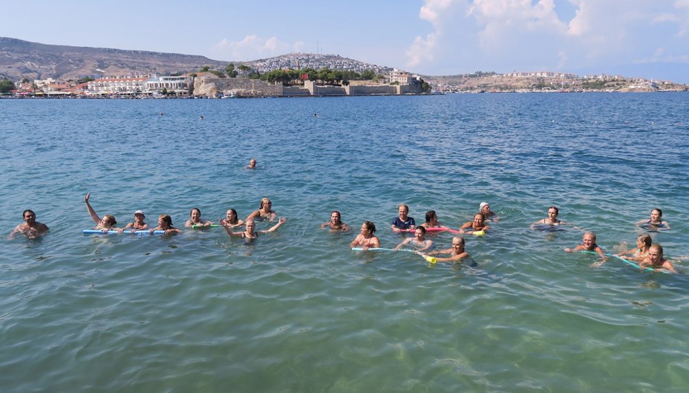 Yaz süresince, Foça Halk Plajı’nda Pazartesi ve Perşembe günlerinde 1’er saat olarak yapılan Su Jimnastiğine dileyen isteyen herkes katılabiliyor.