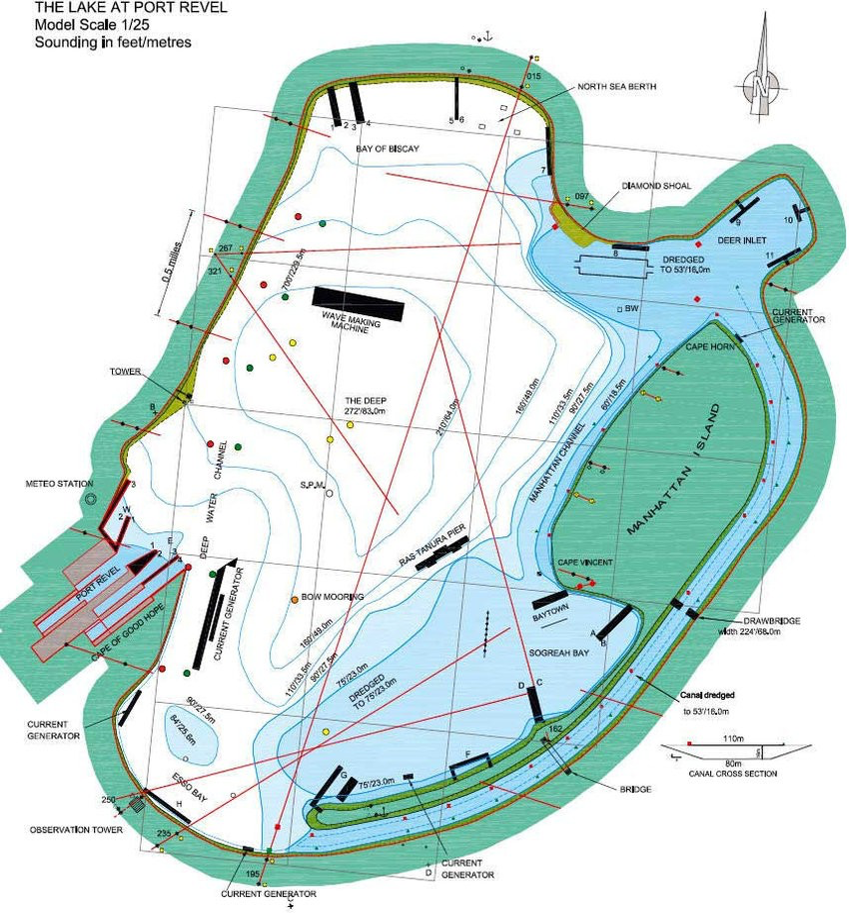 Manevraların yapıldığı gölün içinde haritada görüleceği üzere çeşitli rıhtımlar, bir sığ su kanalı, bir derin su kanalı, dalga, akıntı ve rüzgar yaratma cihazları bulunmaktadır.