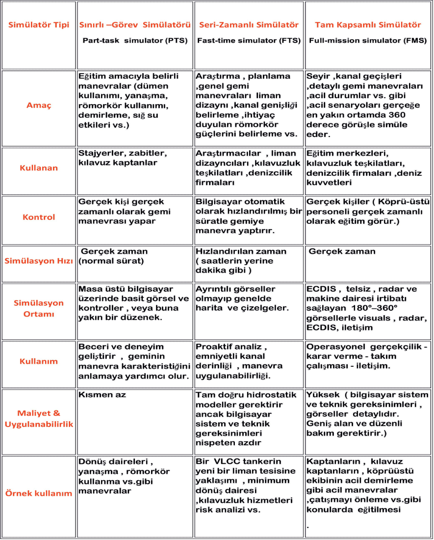 Tablodan da görüleceği üzere tam kapsamlı simülasyon gemi kaptanlarının, gemi zabitlerinin, kılavuz kaptanların ve diğer köprüüstü personelinin eğitiminde sıklıkla tercih edilmekte ve yaygın olarak kullanılmaktadır.