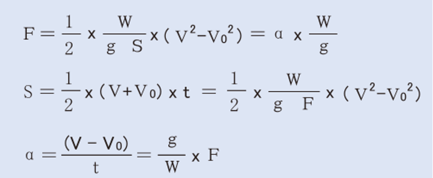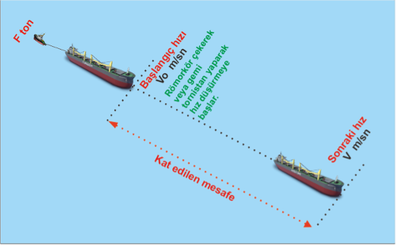 Aşağıdaki şekille gösterildiği gibi bu formülle geminin bir noktadan belli bir noktaya giderken ikinci noktada istenen hıza göre gemiye uygulanması gereken yavaşlatıcı kuvveti ve bu esnada kat edilecek mesafeyi bulabiliriz.