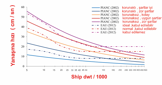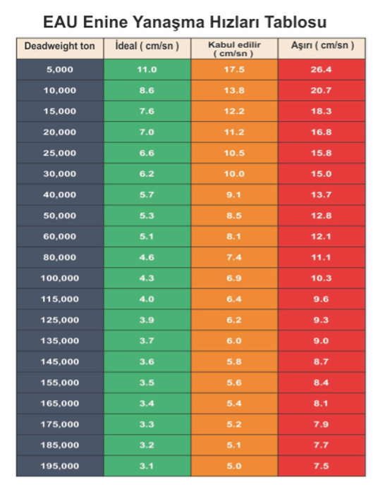 Tablo incelendiğinde özellikle kargo gemilerinin benzeri tonaj ve boydaki konteyner gemilerine kıyasla daha düşük bir süratle yanaşma manevrasına girmelerinin tavsiye edildiği görülecektir.