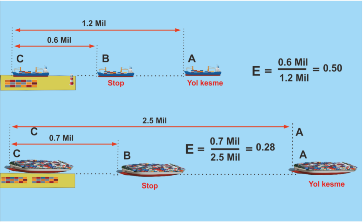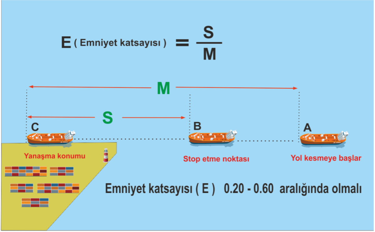 Yukarıdaki şekildeki gemi A noktasına geldiğinde yol kesmeye başlamıştır. B noktası ise makinelerini stop ettiği konumdur. Bu konumdan geminin yanaşacağı noktaya olan mesafe ( S ) , İlk yol kesmeye başladığı konumdan finalde yanaşacağı noktaya olan mesafeye ( M ) bölünerek (E) ile ifade edilen bir emniyet katsayısı elde edilir.