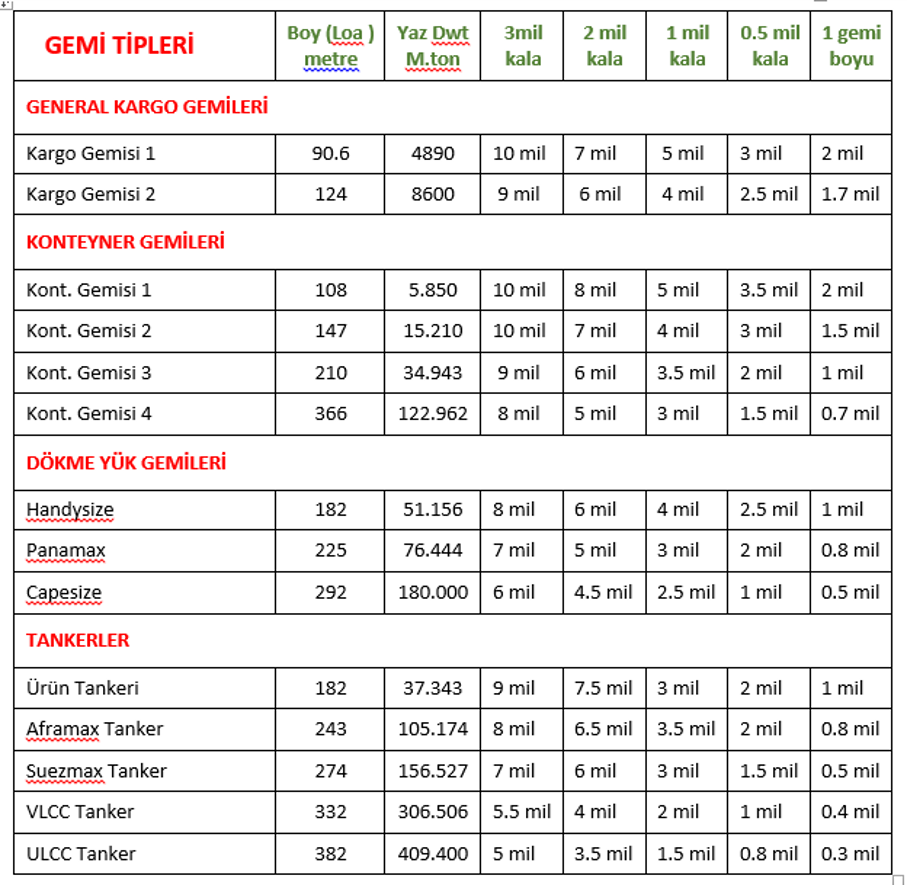 Aşağıdaki tablo oluşturulurken gemilerin tam yüklü oldukları var sayılarak hedefe kalan mesafeye göre olması gereken hızlar verilmiştir. Ancak unutulmamalıdır ki tonajları, boyları birbirine çok yakın olan gemilerin su altı şekilleri, makine güçleri, kapasiteleri birbirinden çok farklı olabilir . Bu nedenle tabloda verilen değerlere kabaca fikir verecek bir referans olarak bakmak ve değerlendirmek daha doğru olur. Bu farklı özelliklere göre bu değerler az ya da çok farklı olabilir ve en doğru değerlendirmeyi yapacak olanlar gemisini herkesten iyi tanıyan ve bölgede görev yapan kılavuz kaptanın danışmanlığından yararlanmasını bilen gemi kaptanları olacaktır. Hatırlatmamız gereken diğer bir husus da akıntı ve rüzgâr etkisi başta olmak üzere bu tabloyu hazırlarken normal ölçüler içindeki doğal şartların dikkate alınmış olduğudur.