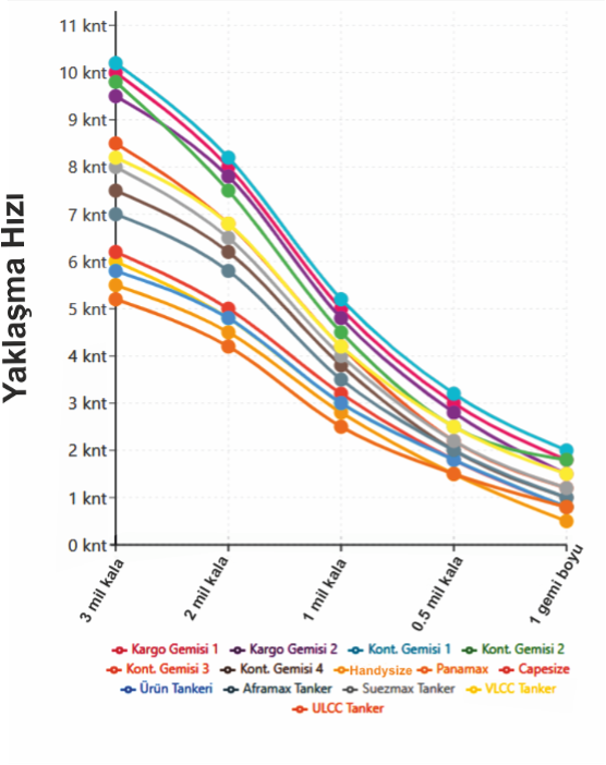 Görüleceği üzere diğer büyük gemi 0.50 emniyet katsayısına denk gelen bir mesafede yol kesmeye kalkarsa muhtemelen rıhtım yaklaşımında emniyet kriterlerinin dışında nispeten yüksek bir hıza sahip olacaktır.