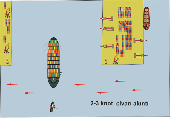 Şekildeki, boyu 200 metre üzerindeki konteyner gemisi, 2-3 knot civarı sıkıcı bir akıntıda yanaşma manevrasına girmektedir.