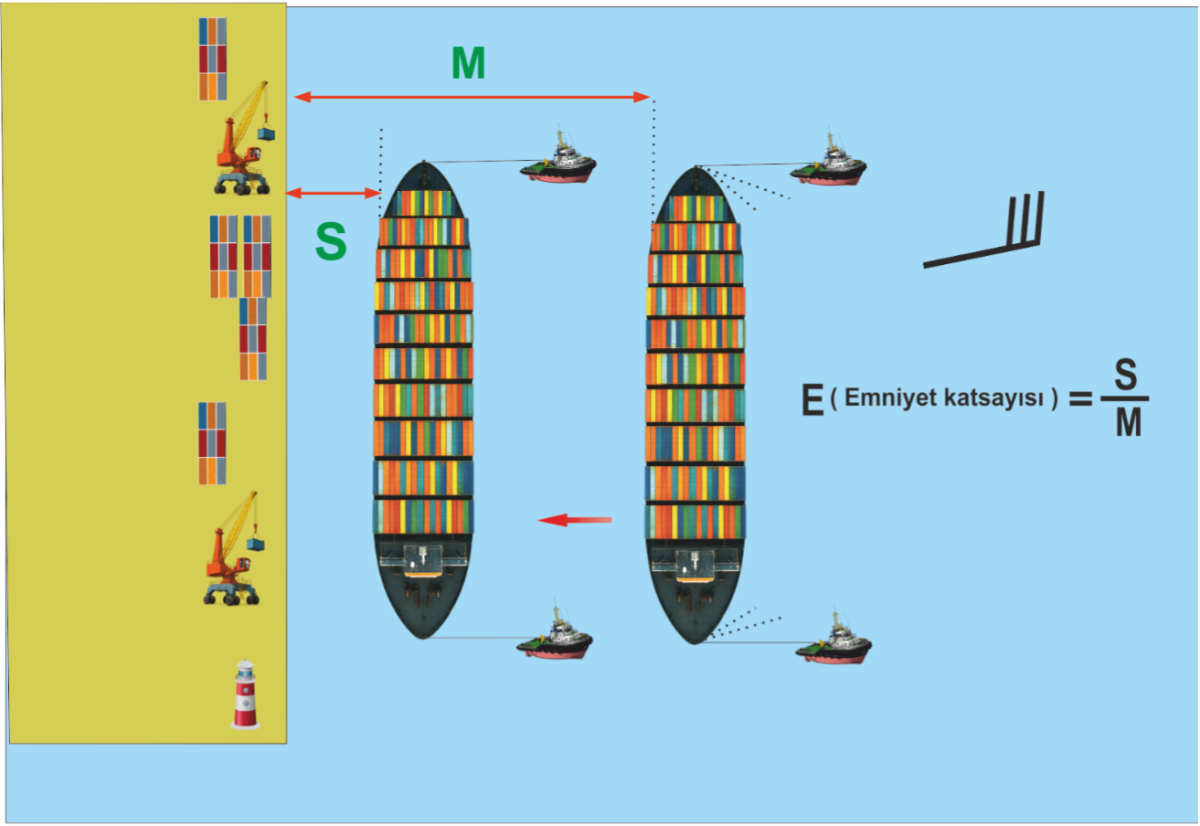 Yukarıdaki şekilde, sert bir sıkıcı rüzgâra karşı baş ve kıçtan bağladığı iki römorkörün yardımıyla yanaşma manevrasında olan bir gemi gösterilmektedir. (M) mesafesi, römorkörlerin rüzgâr etkisine karşı gemiyi çekmeye başladıkları noktadan rıhtıma olan mesafeyi gösterir. (S) mesafesi de geminin yatay hareketinin durduğu noktadan rıhtıma olan mesafeyi gösterir. S değerinin M değerine bölünmesi ile elde edilen emniyet katsayısının, geminin tonajına bağlı olarak 0,20 – 0,60arasında olması tavsiye edilir.