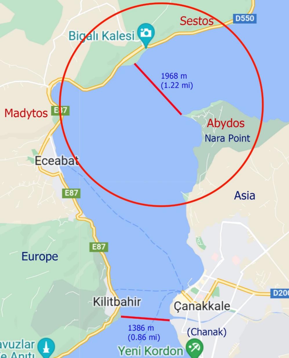 Yine yukarıdaki şekile göz atacak olursak daha güneyde Çanakkale - Kilitbahir arası mesafenin günümüzde 1386 metre olduğu görülecek ve imparatorun mühendislerinin neden bu bölgeyi seçmedikleri sorusu akla gelecektir. Coğrafyacılar bu sorunun cevabını da şu şekilde vermektedirler :