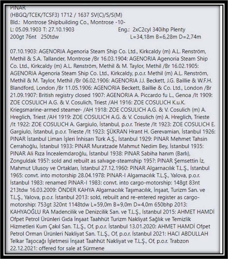 28.04.1979 Algarnacılık Şirketi ile Yalova’da çalıştı.1983 yılında ismi PINAR-I oldu ve yeniden tadil edildi.148gt,83nt,213dwt oldu.