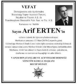 Salim Düzgit –Düzgit Şirketler Grubu adına Hürriyet Gazetesi’ne ayrıca kişisel bir vefat ilanı vermişti. Bu ilanda şöyle yazılıydı; “Ticaret hayatına beraber başladığım ve 1966 yılında ilk şirketimiz İstanbul Boğazı Vapur Hizmetleri firmasının kurucusu değerli dostum Ağabeyim Sayın Arif Erten’in vefatını derin üzüntü ile öğrenmiş