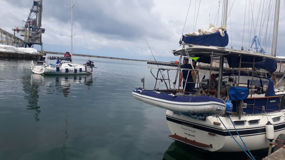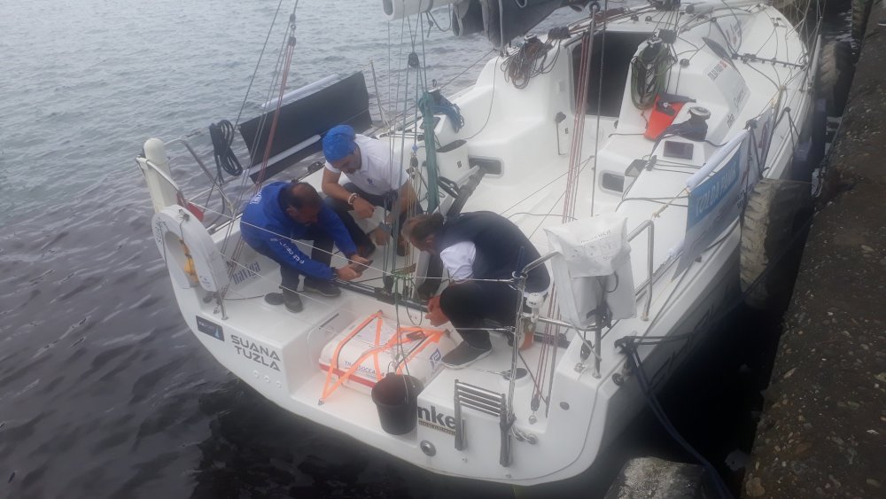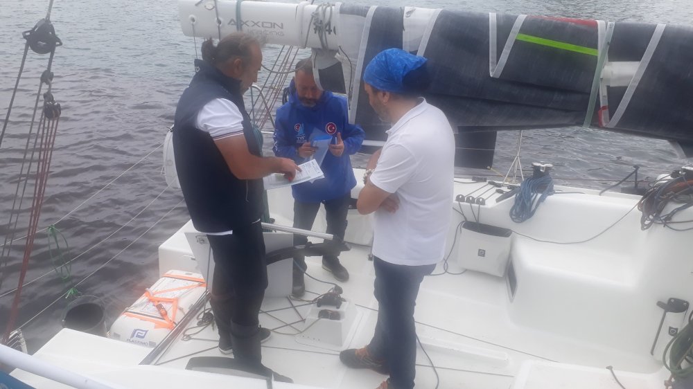 Tolga Pamir, Türkiye Yelken Federasyonu Trabzon İl Hakemi Cem Yılmaz ve Artvin İl Temsilcisi Mustafa Durgun yelkenli teknedeki kontrollerini tamamlayıp, motoru mühürlediler..