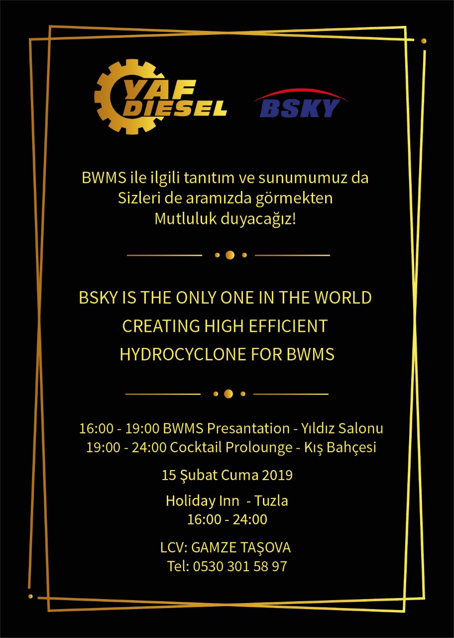 Yaf Diesel ile Çin merkezli BSKY işbirliğiyle 15 Şubat 2019’da, Holiday Inn Tuzla’da düzenlenecek seminerde, patenti BSKY'ye ait olan, hidrosiklon teknolojisine sahip yeni Ballast Water Management System'inin tanıtımı gerçekleştirilecek.