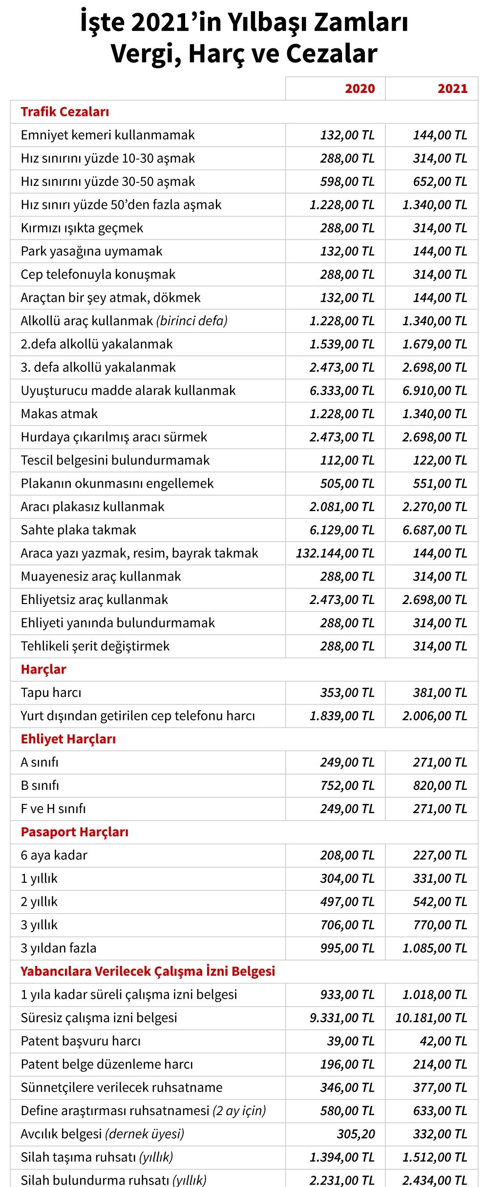 Gelir İdaresi Başkanlığı tarafından Resmi Gazetede yayımlanan tebliğe göre, 1 Ocak 2021'den itibaren devletin halktan topladığı vergi ve harçlarla başta trafik cezası olmak üzere her türlü para cezaları yüzde 9.11 oranında artacak.