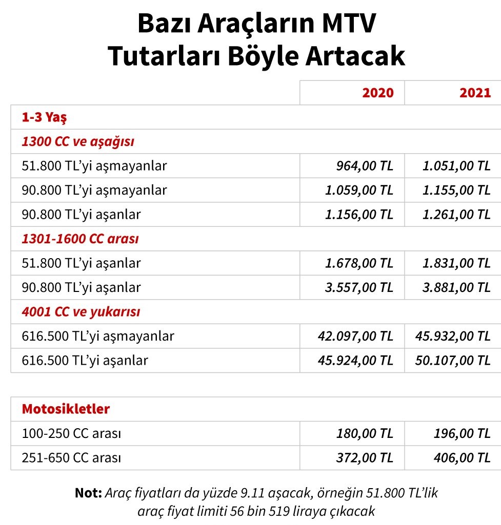 1-3 yaş 1.600 cc araçlardan vergisiz fiyatı 51 bin 800 lirayı aşanların ödediği bin 678 liralık MTV, yeni yılda 56 bin 519 lirayı aşan araçlar için bin 831 liraya çıkacak.