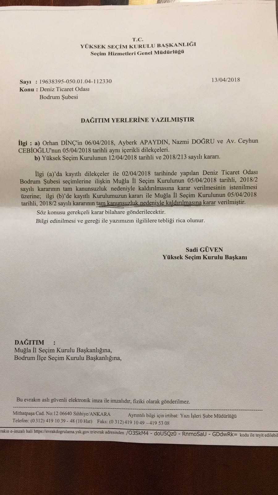 İMEAK Deniz Ticaret Odası Bodrum Şubesi seçimleri için İl Seçim Kurulunun seçim sonuçlarına yapılan itirazı değerlendirmesi sonucunda verdiği iptal kararını bozan Yüksek Seçim Kurulunun kararı bozma nedeni belli oldu. Yüksek Seçim Kurulu kararı "tam kanunsuzluk" nedeniyle bozmuş. YSK, 12.04.2018 tarih 2018/213 sayılı kararı ile ilgili, gerekçeli karar daha sonra bildirilmek üzere İl Seçim Kuruluna gönderdiği yazıda Muğla İl Seçim Kurulunun 05.04.2018 tarih, 2018/2 sayılı kararının tam kanunsuzluk nedeniyle kaldırılmasına karar verildiğini belirtiyor.