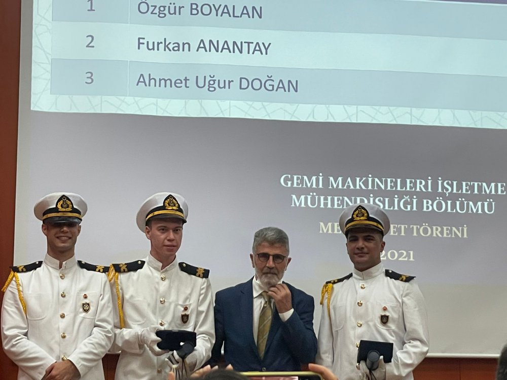 Ardından Gemi Mühendisleri Odası Başkanı Müh. Feramuz Aşkın söz alarak; ‘’Bu güzel öğrencilere bu güzel anları yaşatan, emeği geçen herkese sevgi ve saygılarımı sunuyorum. Uzun bir dönem sonunda mezun oldunuz, denizlere açılıyor ya da tersanelere gidiyorsunuz. Ancak eğitimin bittiğini sanmayın. Gemiye çıktığınızda belki de hiçbir şey bilmediğiniz farkına varacaksınız. Kendi özel örf adet ve gelenekleri olan spesifik bir meslek sahibi oldunuz. Bunun dışında diploma payının gerçekleşebilmesi için Türk bayraklı gemilerde çalışılması gerekmekte. Ancak Türk bayraklı gemi bulmak kolay değil. Bunun yanında biliyorsunuz, Hindistan’daki deniz zabitlerinin sayısı çok fazla ancak pandemi nedeniyle oradan gemiye personel çıkamamakta. Bu nedenle piyasa baş mühendis ve kaptan maaşları 16-17 bin Euro’ya kadar çıktı. Bunu neden söylüyorum, biz Türk denizcisi olarak buradan yeteri kadar payı alamadık. Bunun eğitim boyutuna gelirsek; denizcilik fakültesinde denizlik gelenek ve göreneklerine uygun bir şekilde eğitim yapılmasında fayda görüyorum. Bu kadar yüksek maaş ile çalışılmasının sebebi çok zor bir meslek icara ediyor olmanızdır. Umarım hepiniz buraya sevdiğiniz için gelmişsinizdir. Para için geldiğinizi düşünmek bile istemiyorum.’’ İfadelerini kullandı.