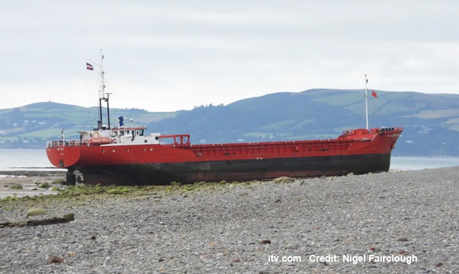Yayınlanan fotoğraflarda karaya oturan Letonya bayraklı geminin gelgit nedeniyle tamamıyla karaya çıkmış vaziyette olduğu görülüyor.