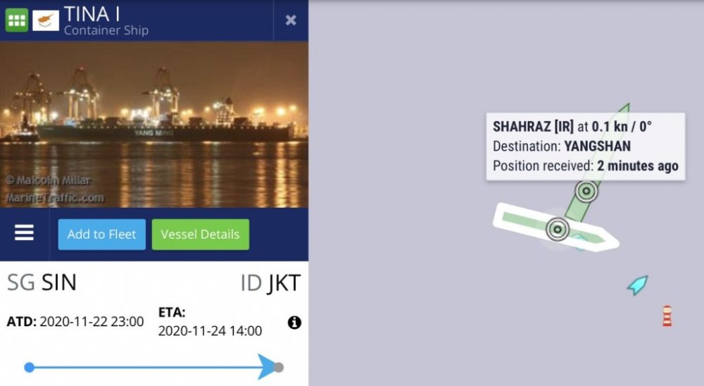 5.576 teu'luk Yunan sahipli Tina 1 isimli konteyner gemisi Pazar günü Endonezya'nın Batam açıklarında karaya oturmuş bir İran sahipli Shahraz isimli konteyner gemisine çarptı.