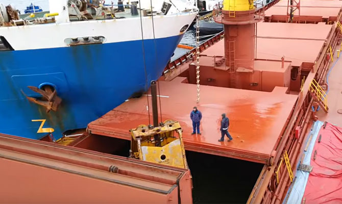 Bordasında su seviyesinin üzerinden ve su seviyesinin altından aldığı ağır hasarlar nedeniyle dökme yük gemisi Afrin 1'deki demir cevheri yükünün, gemi hafiflediğinde deliklerin su yüzeyine çıkması için gemilere yanaşan bir mavnaya boşaltıldığı kurtarma operasyonuna dair görüntüler ortaya çıktı.
