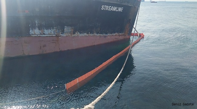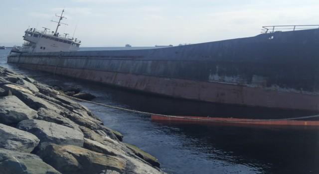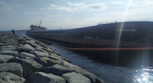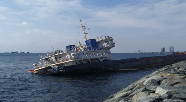 Olumsuz hava şartlarından etkilenen geminin sol arka kısmında batma meydana gelirken, durumun daha da kötüye dönmesini engellemek için ekipler tarafından gemi, kıyıdan halatla bağlandı ve çevresine set çekildiği görüldü.